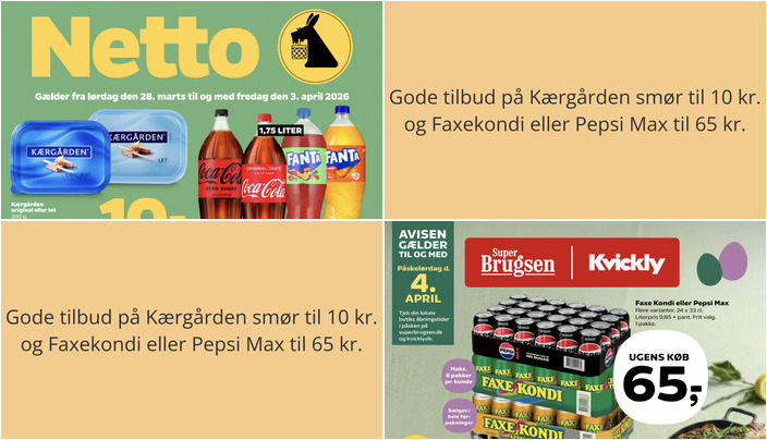 SuperBrugsen tilbyder Faxekondi eller Pepsi Max i flere varianter, 24 x 33 cl pakker til kun 65 kr. pr. pakke. Der er en begrænsning på maks. 6 pakker pr. kunde. Tilbuddet er gældende fra fredag den 27. marts til lørdag den 4. april.