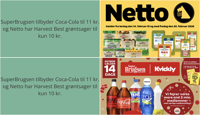 SuperBrugsen tilbyder Coca-Cola, Fanta eller Schweppes i flere varianter på 125-150 cl til kun 11 kr. pr. flaske. Tilbuddet gælder fra fredag den 6. februar til og med torsdag den 19. februar 2026.